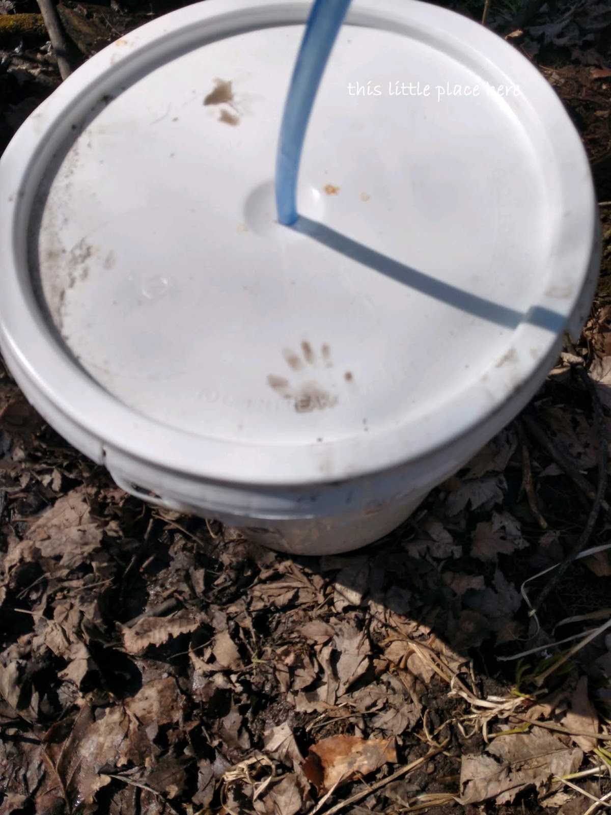 The syrup season has been a crappy one, if I may be blunt. The weather has mainly been too cold, too warm, too rainy, or too windy for the sap to run. As a result, I've only boiled down one more batch of syrup, which yielded 1 qt and 1 pt. The local wildlife have been checking out my sap buckets in the woods, as evidenced by the muddy paw prints left behind.
